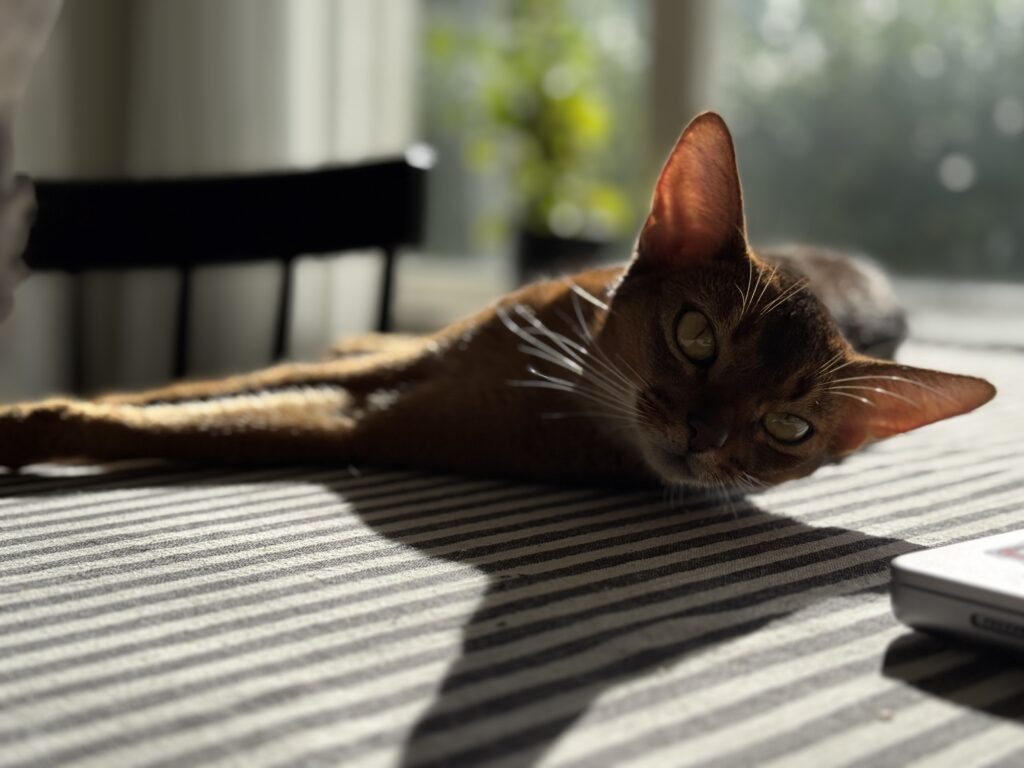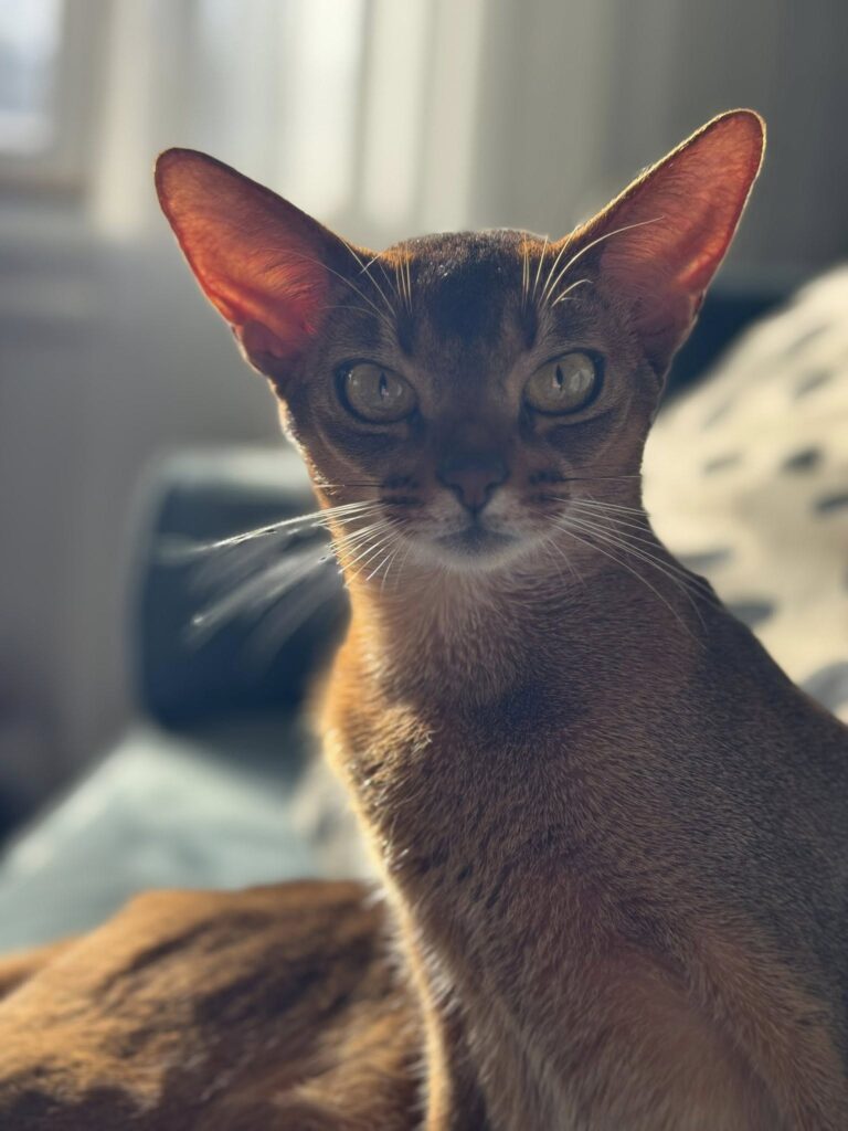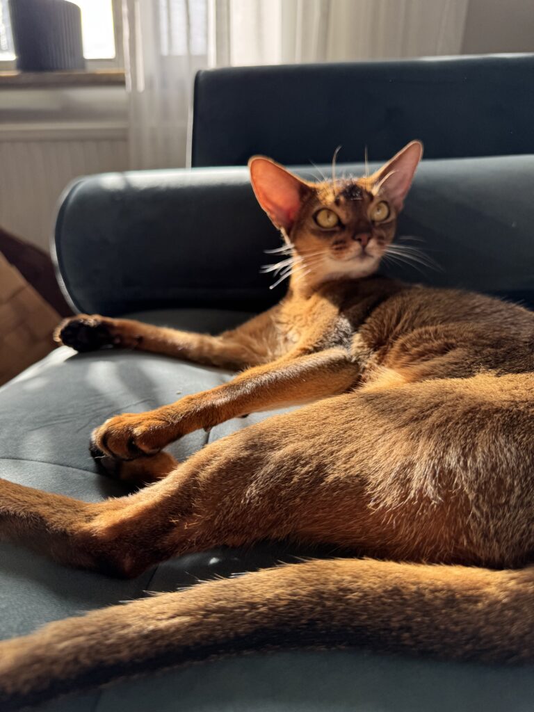 Tassa är vår första abessinier och har tagit hela vår familj med storm. Hon är lekfull, smart, matglad och kärleksfull. Älskar att apportera allt som man kastar åt henne och flyger ner för trappan för att fånga hennes byte. Hon är en virvelvind med ett hjärta av guld.